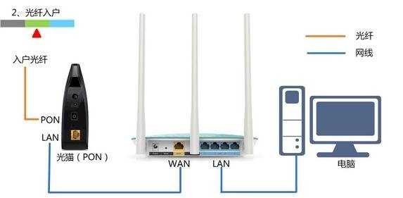 2、光纤上网:请准备2根网线,一根网线用来连接光猫与路由器的WAN接口;另一根网线用来连接腾达路由器上路由器上LAN(1/2/3/4)口中的任意一个与计算机。