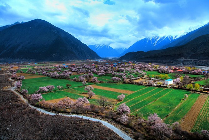 在林芝拍摄桃林,特别适合用广角镜头站在半山腰拍摄。利用广角拍摄可将未融的雪山、蜿蜒的江流、成片的桃林同时囊括进镜头。但是想要拍摄到较好位置的照片,就必须攀爬上半山腰,而大多数山坡都没有路,加上春天正是雨季,路面较滑,所以爬山时一定要注意安全。