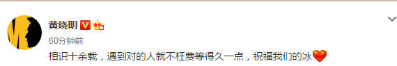 @黄晓明:相识十余载,遇到对的人就不枉费等得久一点,祝福我们的冰