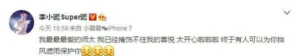 @李小璐:我最最最爱的师太,我已经掩饰不住我的喜悦,太开心啦啦啦,终于有人可以为你挡风遮雨保护你